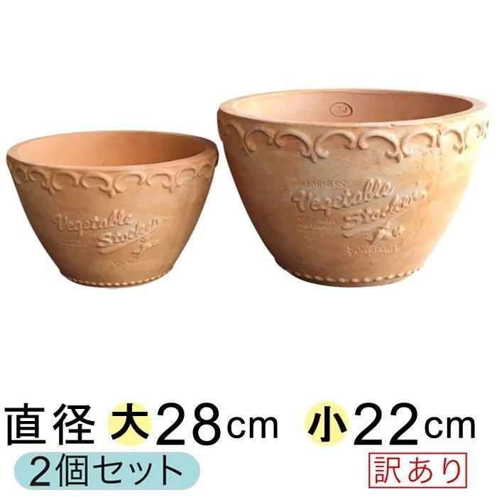 訳あり おしゃれ 模様入り 植木鉢 丸 浅型 HM白粉 素焼き鉢 テラコッタ 大小2個セット